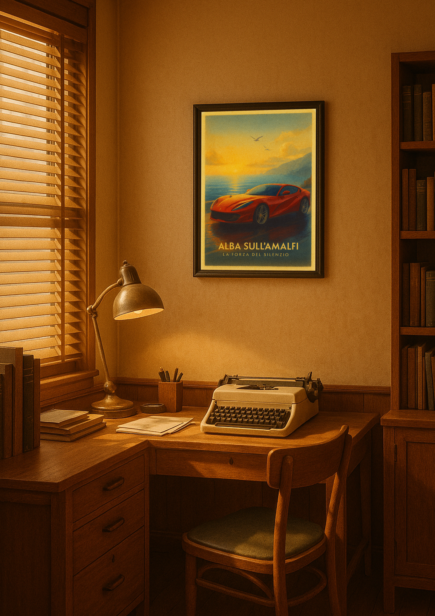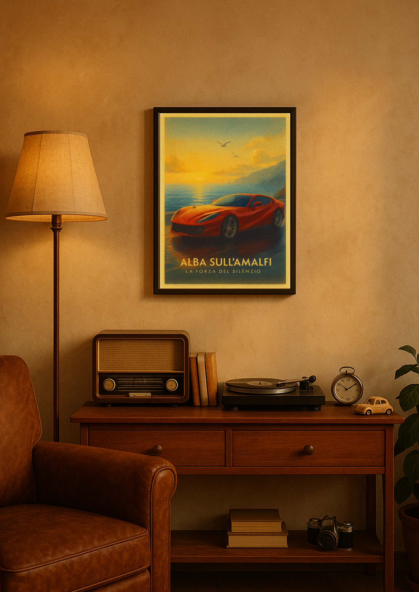 • Plakat w formacie A3 (29,7 × 42 cm) – wysokiej jakości wydruk w stylu vintage, inspirowany włoską motoryzacją i klasycznym designem.