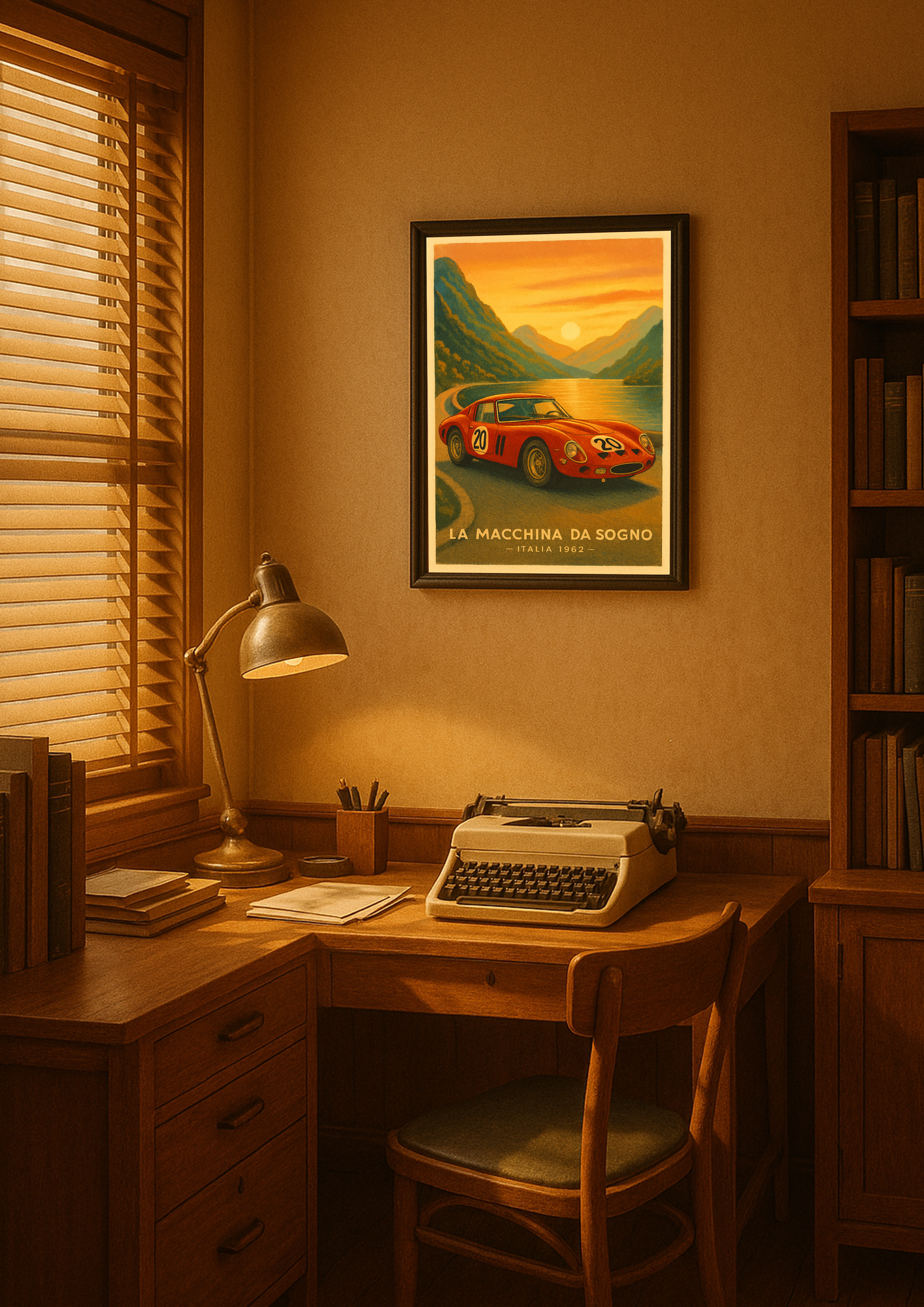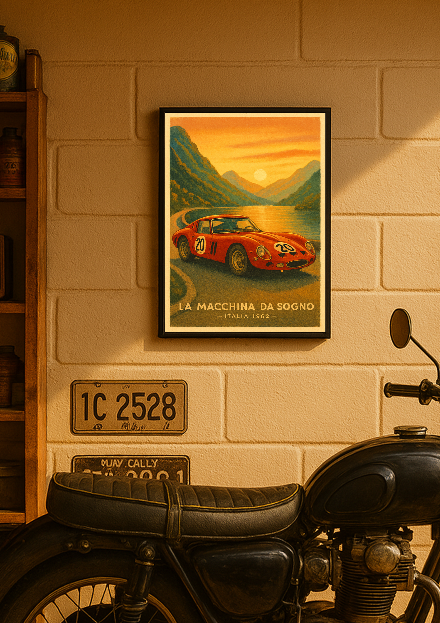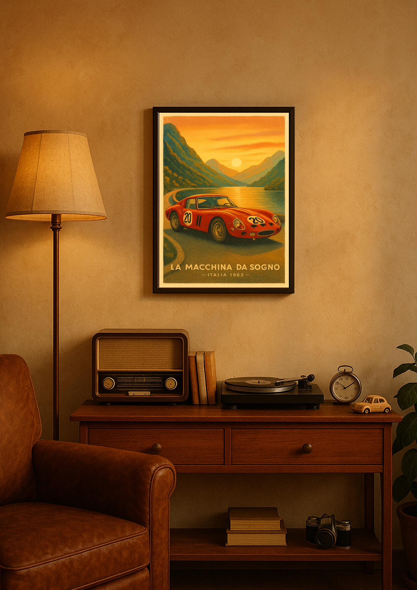 • Plakat w formacie A3 (29,7 × 42 cm) – wysokiej jakości wydruk w stylu vintage, inspirowany włoską motoryzacją i klasycznym designem.