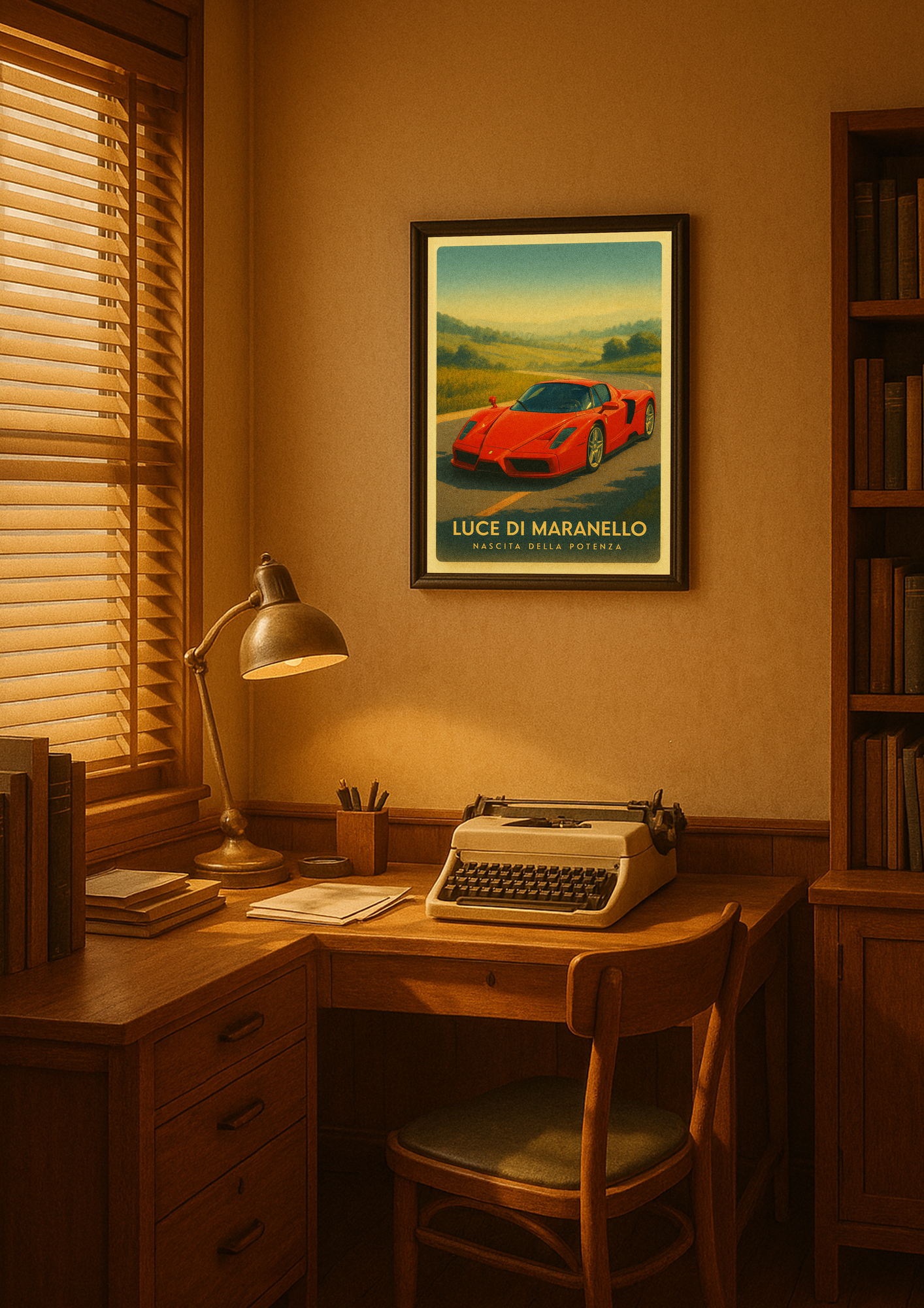 • Plakat w formacie A3 (29,7 × 42 cm) – wysokiej jakości wydruk w stylu vintage, inspirowany włoską motoryzacją i klasycznym designem.