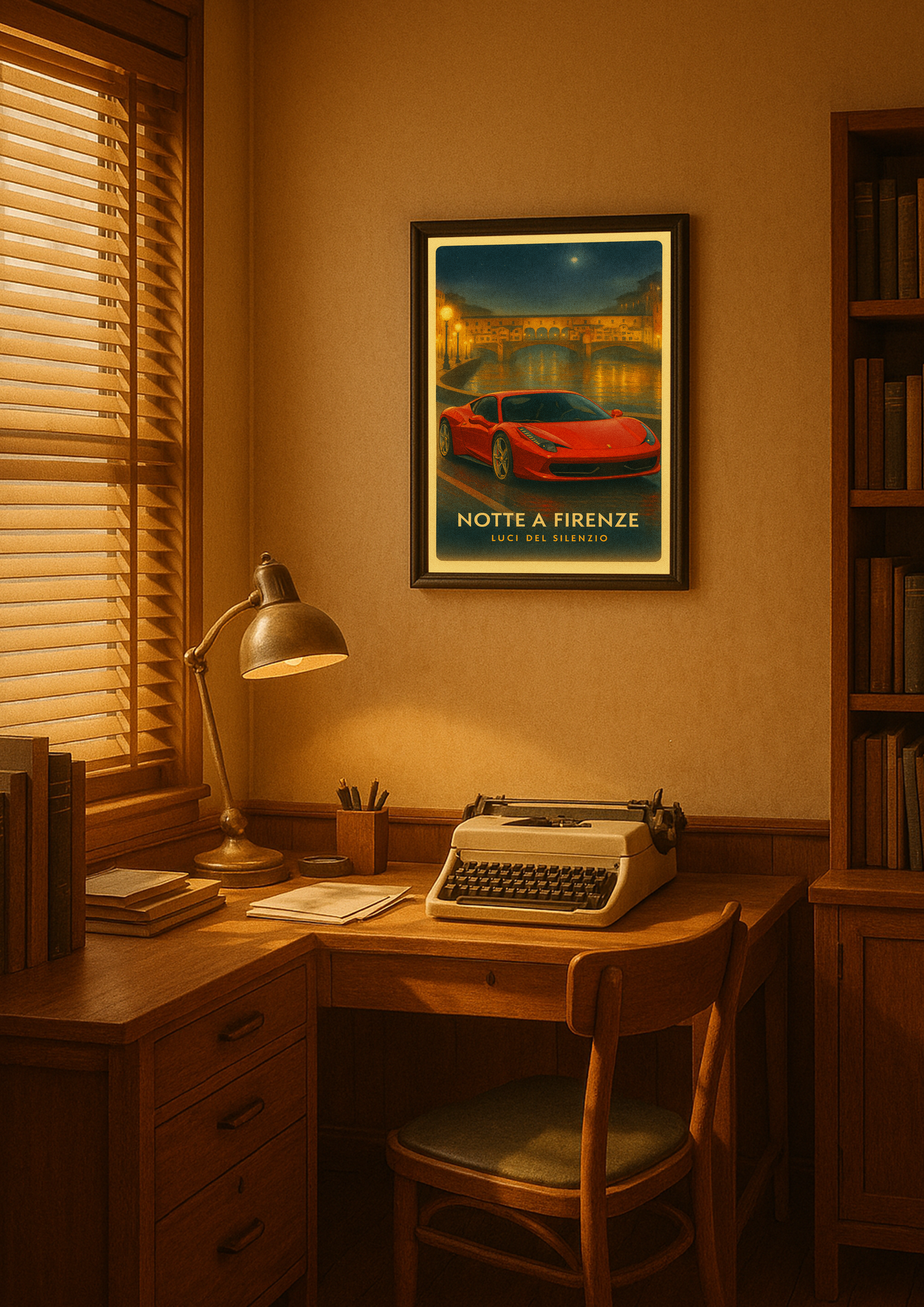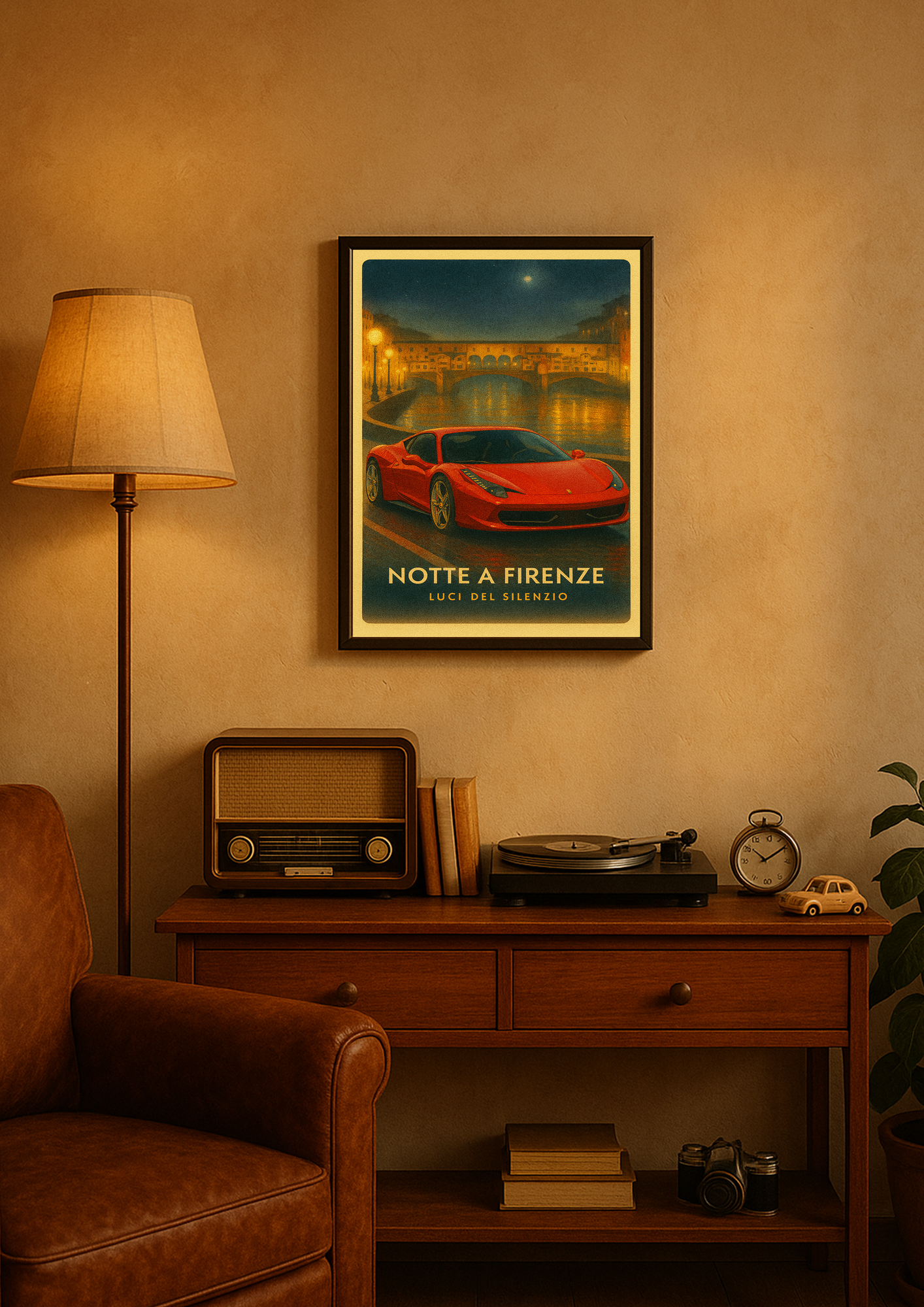 • Plakat w formacie A3 (29,7 × 42 cm) – wysokiej jakości wydruk w stylu vintage, inspirowany włoską motoryzacją i klasycznym designem.