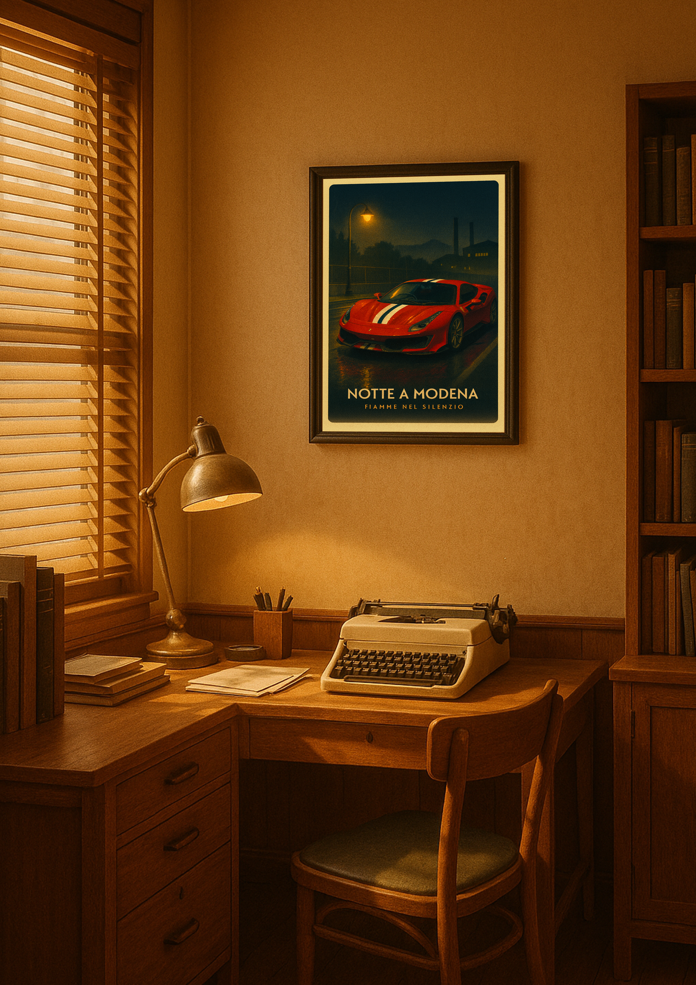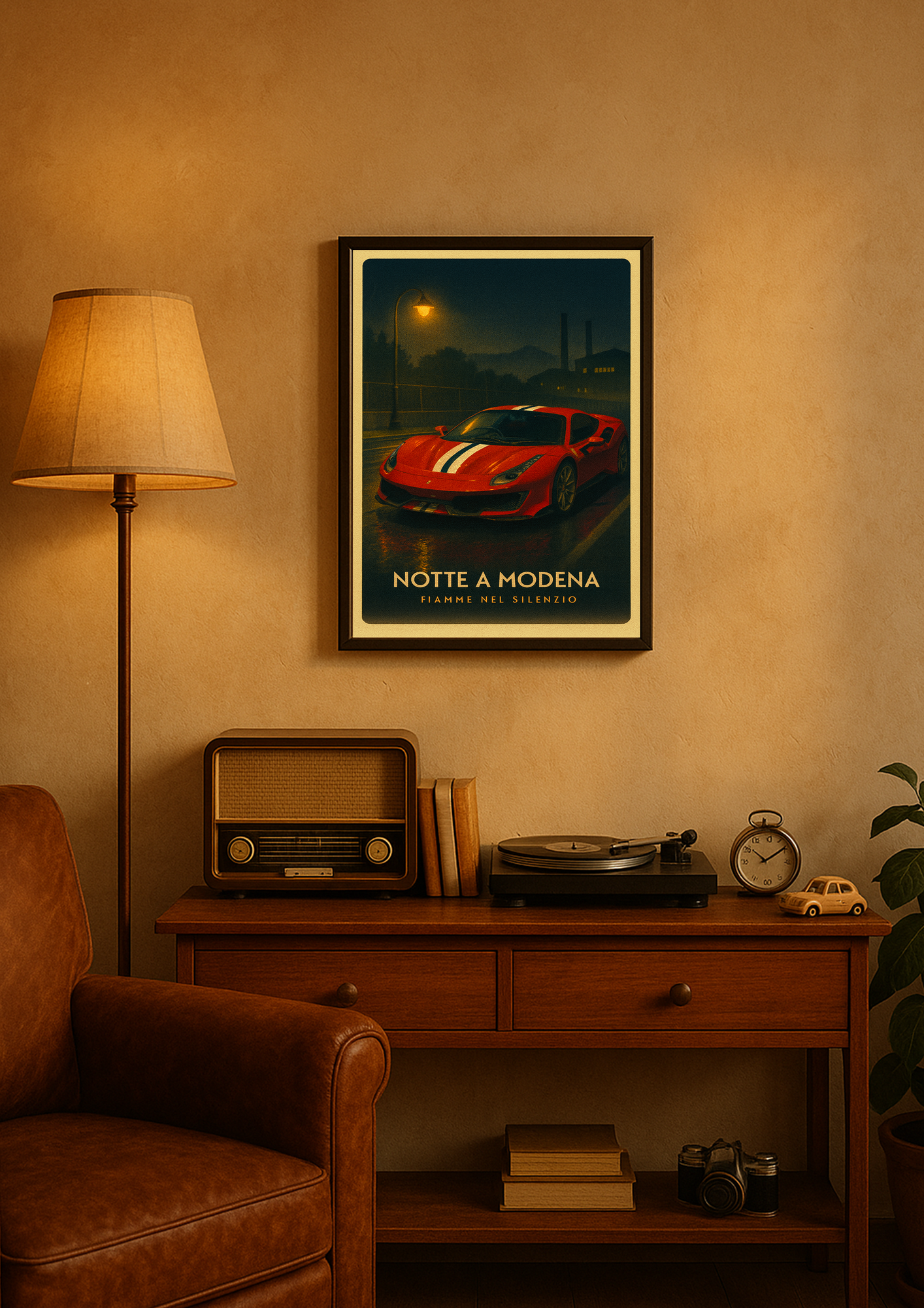 • Plakat w formacie A3 (29,7 × 42 cm) – wysokiej jakości wydruk w stylu vintage, inspirowany włoską motoryzacją i klasycznym designem.