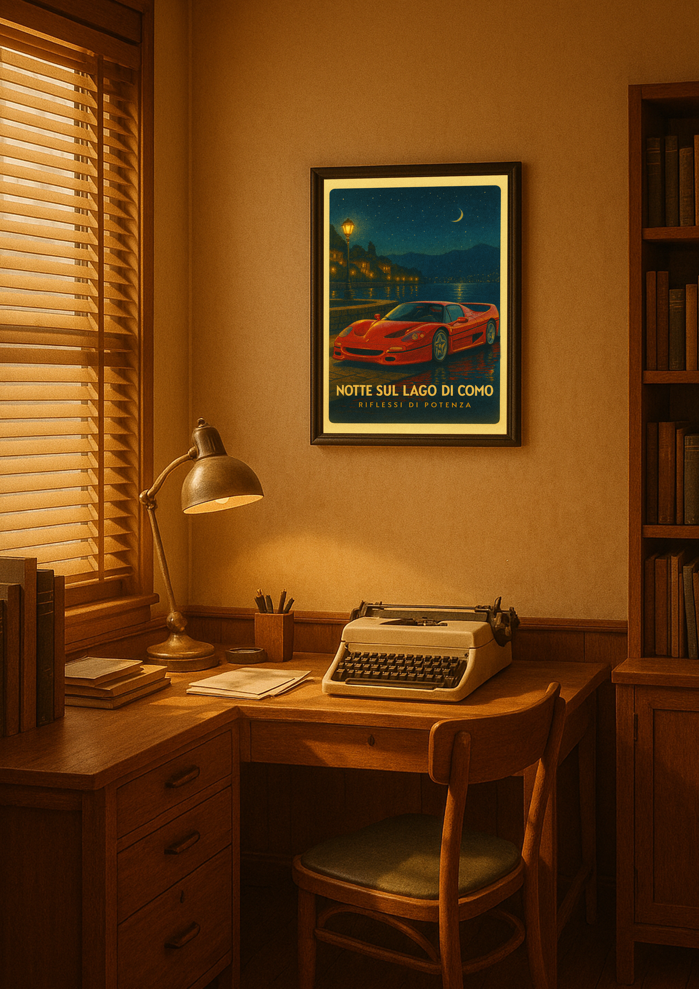 • Plakat w formacie A3 (29,7 × 42 cm) – wysokiej jakości wydruk w stylu vintage, inspirowany włoską motoryzacją i klasycznym designem.